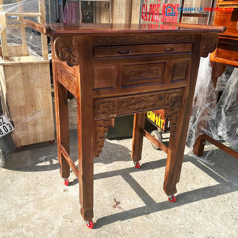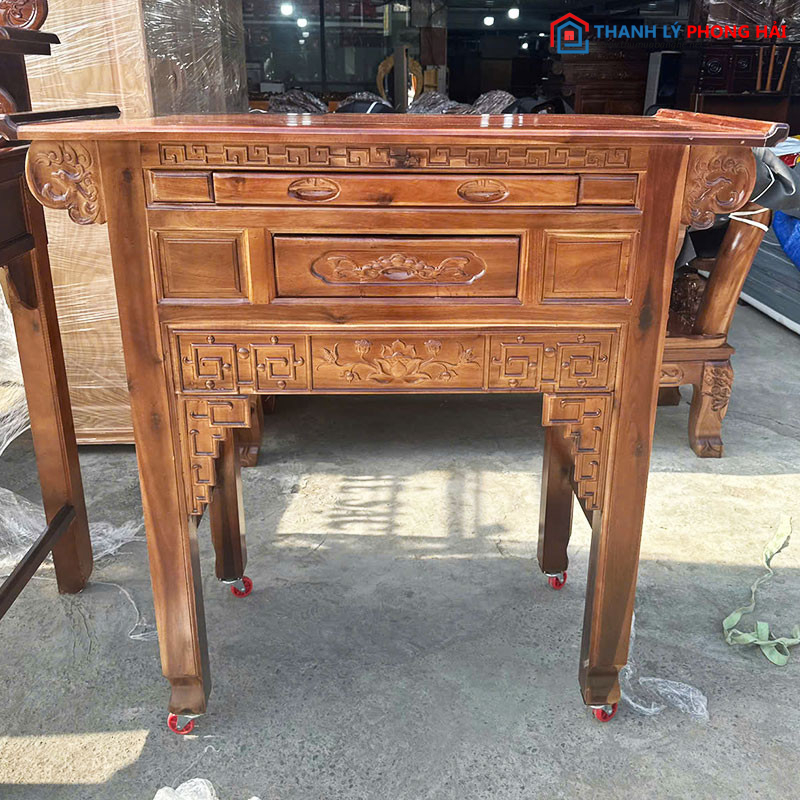 Điểm tiện lợi của mẫu này là ngăn kéo ở giữa, giúp cất nhang đèn, bật lửa, bao thư hoặc giấy tiền vàng sạch sẽ và gọn gàng. Các chi tiết chạm nhẹ ở chân và yếm tạo điểm nhấn hài hòa, không quá cầu kỳ nhưng vẫn giữ được vẻ trang trọng cần có của một bàn thờ gia đình.