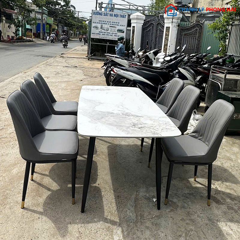 Bộ bàn ăn với thiết kế hiện đại, mặt đá vân mây mang đến vẻ đẹp thanh lịch và dễ dàng bảo trì. Kích thước bàn dài 1m6, phù hợp cho gia đình hoặc không gian nhà hàng, quán ăn. Đi kèm là 6 ghế da cao cấp màu xám, chân thép sơn tĩnh điện chắc chắn, tạo cảm giác thoải mái và bền bỉ khi sử dụng lâu dài.
