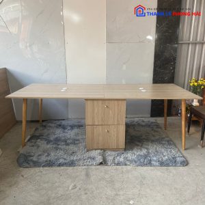 - Mô tả: Mẫu bàn làm việc đơn giản và sang trọng. Được sử dụng chất liệu gỗ công nghiệp cao cấp nên cực kỳ chắc chắn và cứng cáp, đặc biệt bàn còn được tích hợp thêm 1 tủ nhỏ 2 ngăn kéo cực kỳ tiện lợi ở giữa để lưu trữ đồ đạc, giấy tờ,… Mặc dù đã qua sử dụng nhưng hiện trạng bàn vẫn còn đẹp và mới, không hỏng hóc hay hư hại.