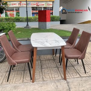 - Mô tả: Bộ bàn ăn gia đình gồm 1 bàn, 4 ghế với thiết kế sang trọng, hiện đại. Bàn được làm với chất liệu gỗ cứng cáp, mặt bàn với đường vân đẹp mắt, uyển chuyển. Ghế bọc simili có lưng tựa êm ái, mang đến cảm giác thoải mái khi sử dụng.