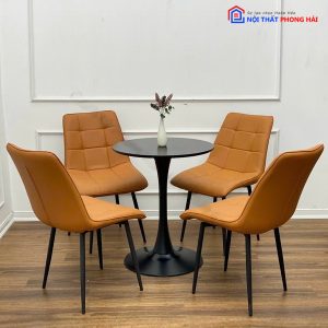 - Mô tả: Bộ bàn Cafe 4 ghế này mang phong cách hiện đại và sang trọng. Mặt bàn làm từ gỗ, chân bàn được thiết kế theo hình hoa Tulip và được phủ lớp sơn đen, tạo ra một cảm giác bí ẩn và độc đáo. Bộ ghế có lớp bọc PU màu vàng nâu là điểm nhấn, đồng thời có lưng tựa giúp ngồi thoải mái và dễ chịu. Đây là sự kết hợp hoàn hảo cho không gian quán Cafe, tạo nên một không gian đẳng cấp và thu hút khách hàng.