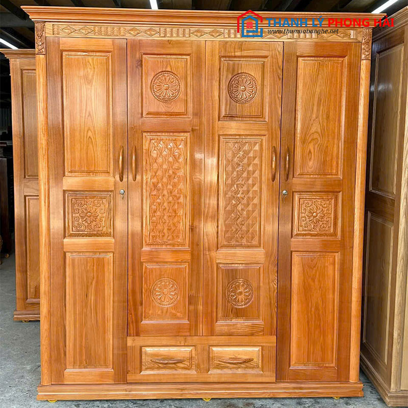 Tủ quần áo gỗ sồi tự nhiên với thiết kế 4 cánh truyền thống, chạm hoa văn nổi tỉ mỉ, tạo điểm nhấn sang trọng. Chất gỗ sồi dày chắc, không cong vênh mối mọt, độ bền cao theo năm tháng. Tủ chia ngăn hợp lý với 2 cánh treo đồ, 2 cánh xếp và 3 hộc kéo dưới tiện lợi. Màu gỗ sồi sáng, dễ phối với nhiều kiểu phòng ngủ. Phù hợp cho gia đình, khách sạn, hoặc người thích phong cách đồ gỗ tự nhiên.